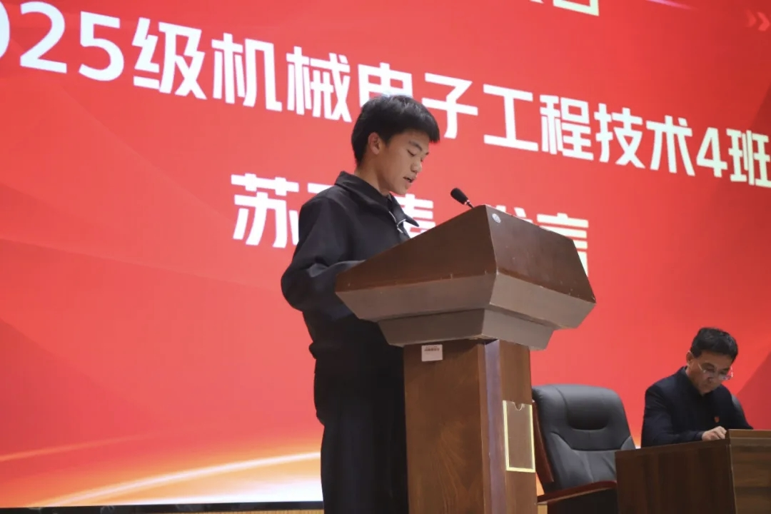 2025级机械电子工程技术4班学生苏玉涛作为新生代表发言。他分享了自身的求学经历,讲述自己选择机械电子工程技术专业的原因,并分享了入校以来的感受,他号召全体新生努力成为既有理论素养,又有实践能力的复合型人才,展现出第一届本科学生的风采与水准,为学校的发展贡献自己的力量。